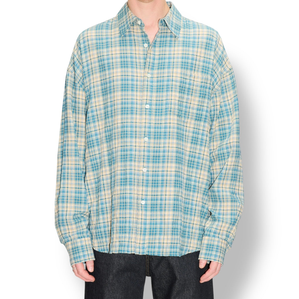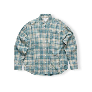 The Room Shirt is a relaxed, boxy-fit shirt featuring dropped shoulders and a curved hem for effortless wear. Thoughtful details include mother-of-pearl buttons and adjustable cuffs. Shown here in a pastel green check with a textured seersucker effect.